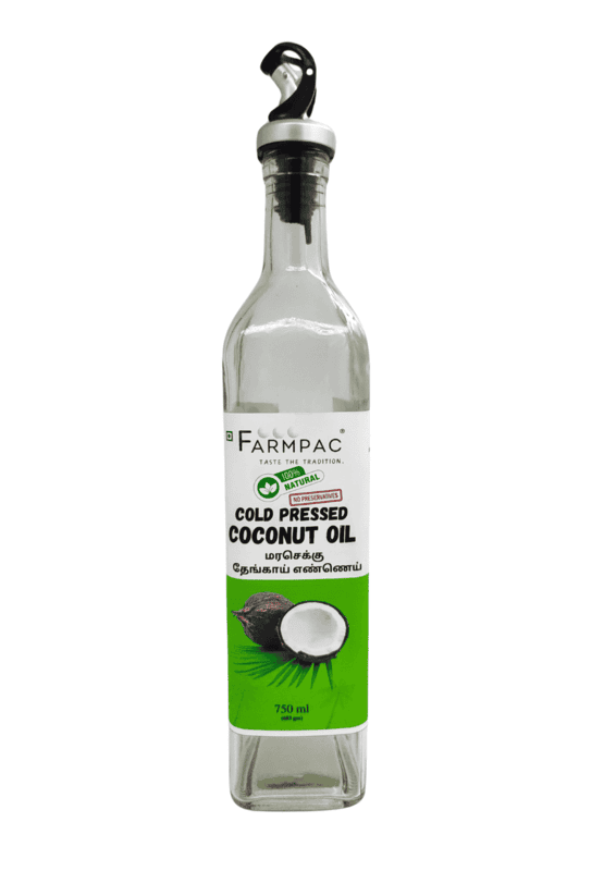 Cold Pressed 750 ml-Coconut Oil (Unsulphur Copra)-GlassBottle with Dispenser/ மரச்செக்கு தேங்காய் எண்ணெய்(சல்பர் இல்லாதது) -750 ml