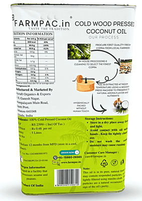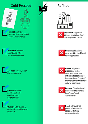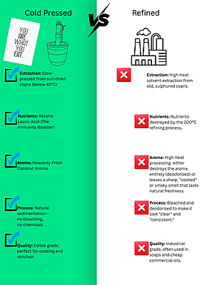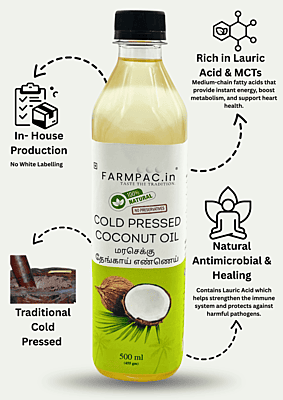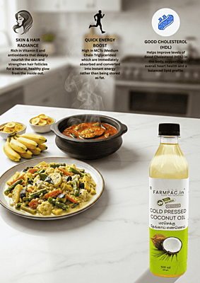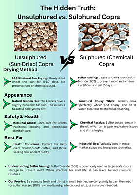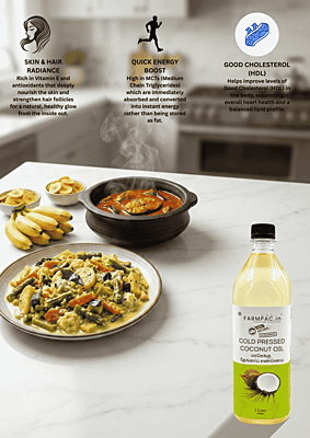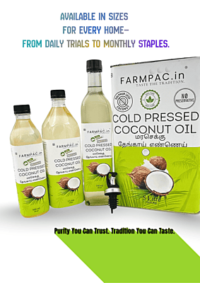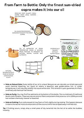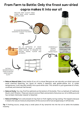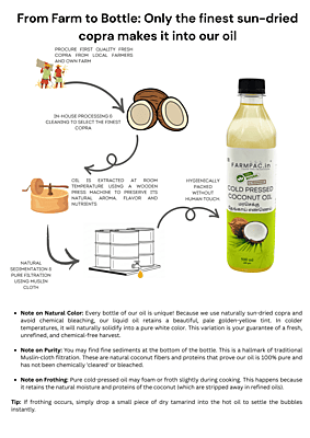 Sun-Dried & Sulphur-Free – The Honest Choice At Farmpac, our main promise is purity. Unlike mass-produced oils that use chemical-processed copra, our Coconut Oil is extracted from Sulphur-Free, Sun-Dried Copras. Using traditional wood pressing, we preserve the natural Lauric Acid and fresh aroma without any refining, bleaching, or deodorizing. Sulphur-Free USP: No toxic chemical drying; 100% safe for your family’s health. Natural Immunity: Rich in Lauric Acid and healthy medium-chain fats. Total Purity: No mineral oils, liquid paraffin, or artificial fragrances.