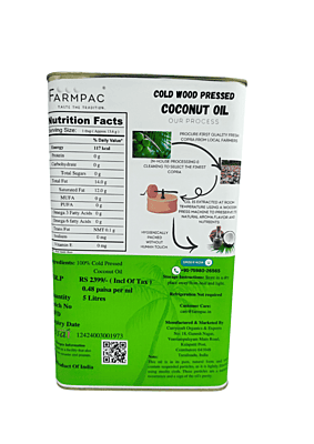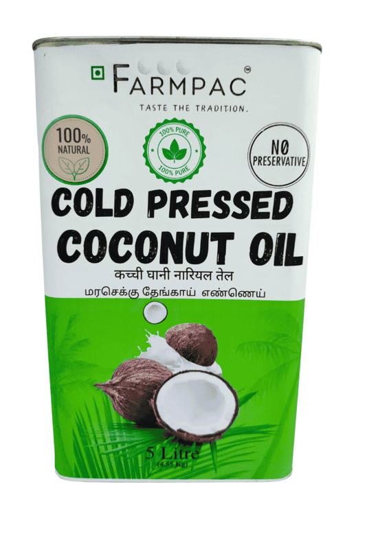 Cold Pressed 5 Litre-Coconut Oil (Tin with Anti-Spill Spout)-Unsulphur Copra / மரச்செக்கு தேங்காய் எண்ணெய்(சல்பர் இல்லாதது)-5 லிட்டர்