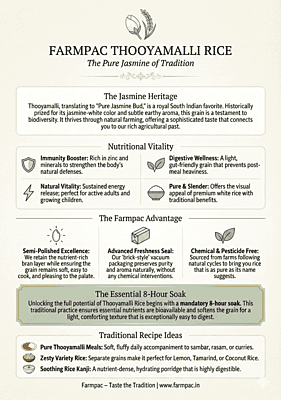 Experience the elegance of Farmpac Semi-Polished Thooyamalli Rice. Named after the jasmine bud for its pure white appearance and delicate nature, this traditional rice variety is a masterpiece of native agriculture. Our gentle semi-polishing process ensures the grain retains its vital inner bran layer, offering a perfect harmony of significant nutritional value and the soft, pleasing texture preferred by families for daily meals.