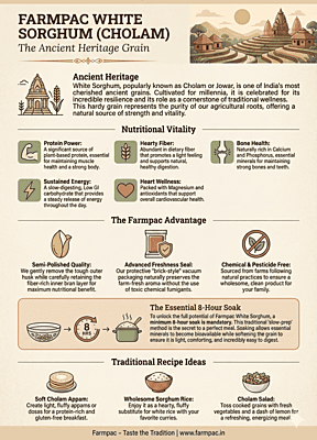 Experience the revitalizing power of Farmpac Semi-Polished White Sorghum (Cholam). This ancient super-grain has been a foundation of wellness in India for generations. Our gentle semi-polishing process ensures the grain retains its vital inner bran layer, offering a perfect balance of significant nutritional value and a soft, pleasing texture that integrates seamlessly into your daily meals.